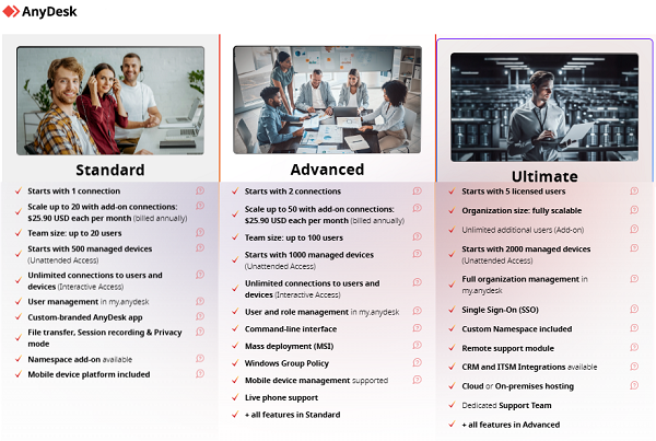AnyDesk Standard là phần mềm điều khiển máy tính từ xa của AnyDesk, tối ưu cho các nhóm nhỏ, doanh nghiệp vừa và nhỏ hoặc IT Helpdesk. Nó cho phép 20 người dùng được cấp phép, mặc định 1 kết nối đồng thời (và có thể mua thêm), không giới hạn thiết bị truy cập và quản lý tối đa 500 thiết bị.