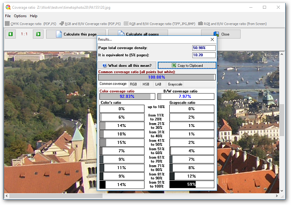 Đo độ phủ màu của từng trang hoặc độ phủ màu trung bình của tài liệu trong tệp PostScript hoặc PDF (*.ps, *.pdf) với hệ màu CMYK (tối đa 8 điểm màu). Để sử dụng tính năng này, bạn cần cài đặt GPL Ghostscript 10.04.0 cho Win32 hoặc Win64.