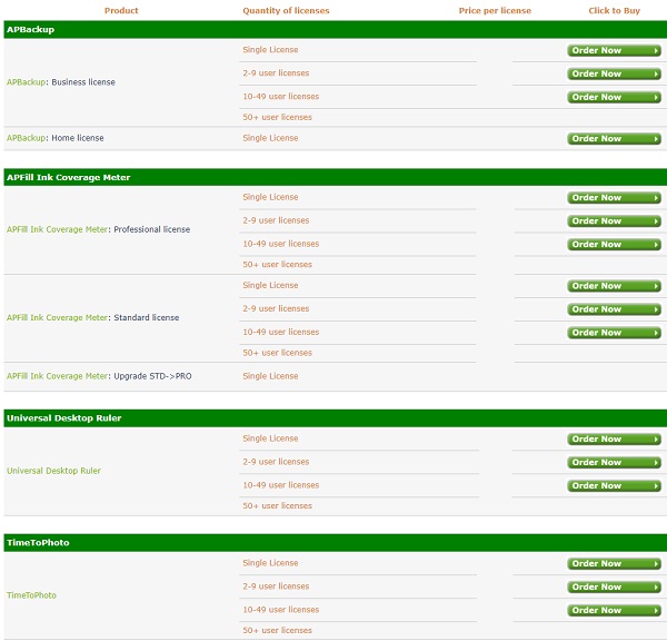 - Chọn sản phẩm bạn muốn cài đặt, ví dụ như APBackup, APFill Ink Coverage Meter, TimeToPhoto, hoặc Universal Desktop Ruler.