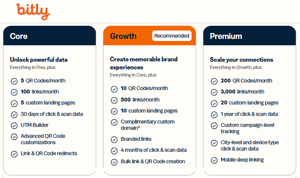Bitly Growth là gói dịch vụ tài khoản trả phí trên nền tảng Bitly, được thiết kế dành cho các doanh nghiệp và marketer cần quản lý số lượng lớn liên kết, mã QR và trang đích (landing pages). Gói này cung cấp các tính năng cao cấp như tên miền tùy chỉnh (custom domains), phân tích dữ liệu chuyên sâu, quản lý thương hiệu và khả năng tích hợp linh hoạt, giúp tối ưu hóa hiệu quả các chiến dịch tiếp thị kỹ thuật số.
