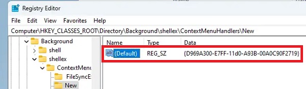 Tìm đến đường dẫn HKEY_CLASSES_ROOT\Directory\Background\shellex\ContextMenuHandlers > kiểm tra xem trên này có giá trị (Default): {D969A300-E7FF-11d0-A93B-00A0C90F2719} không > Nếu không thì tạo mới giá trị này.