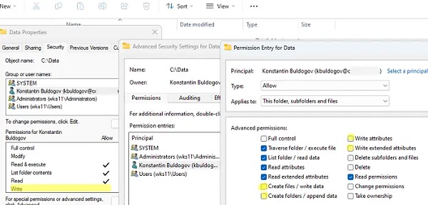 Nếu menu ngữ cảnh thiếu tùy chọn tạo file/folder > trước tiên hãy kiểm tra quyền NTFS cho thư mục. Để bật tính năng tạo tệp, tài khoản người dùng hoặc nhóm phải có: