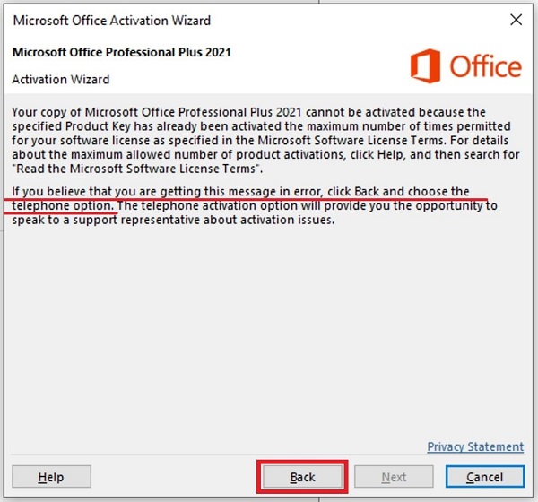 Sau khi nhập key kích hoạt sẽ gặp lỗi như hình bên dưới > lúc này cần click Back như hướng dẫn.