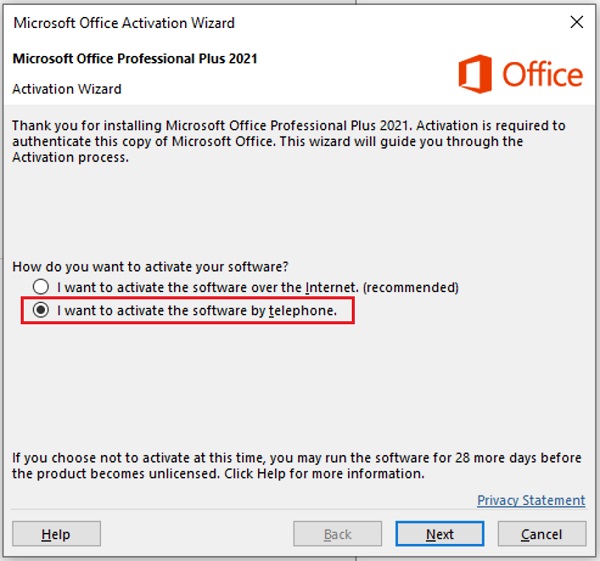 Khi gọi điện thoại > làm theo hướng dẫn tự động > nhấn phím 1 > đồng ý ghi âm cuộc trò chuyện > sau đó nhấn phím 3 > Kích hoạt Office > sau đó nhấn phím 1 và nhập Installation ID bằng bàn phím điện thoại.