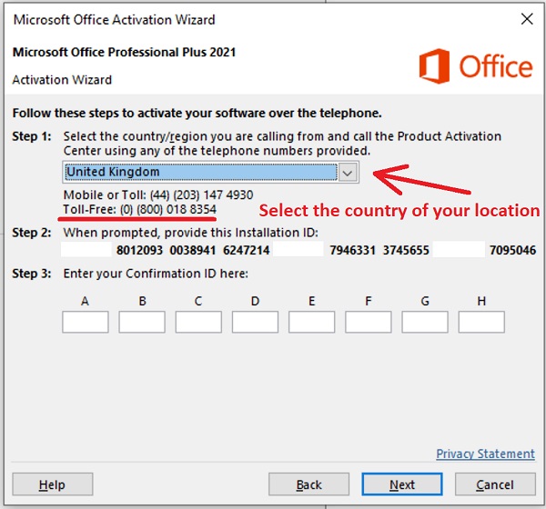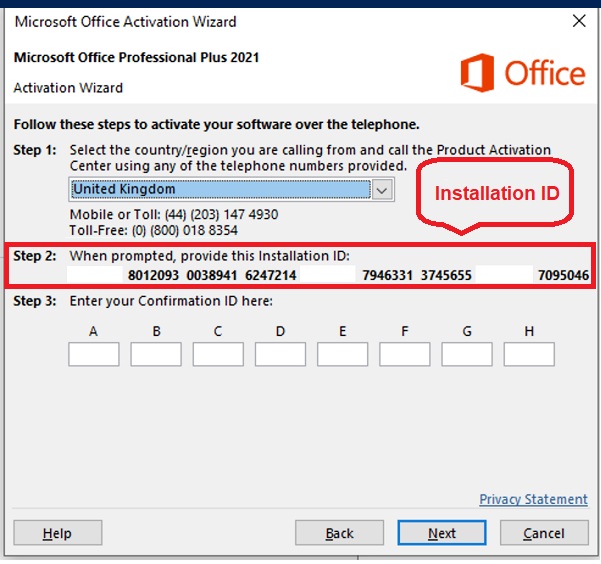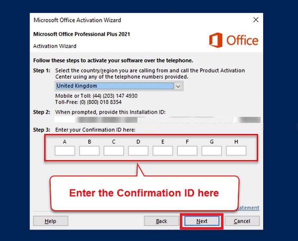 Hãy lắng nghe hệ thống tự động một cách cẩn thận. Nó sẽ cung cấp cho bạn Confirmation ID sau khi xác minh Installation ID của bạn > ID này sẽ cần được nhập vào các trường từ A đến H và kích hoạt Microsoft Office.