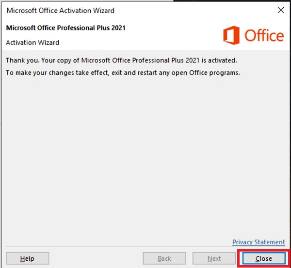 Nếu quá trình kích hoạt thành công sẽ hiển thị một bảng thông báo Đã kích hoạt > click Close để hoàn tất.