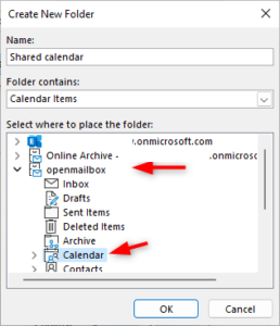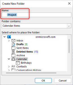 Đặt tên cho lịch mới > chọn vị trí lưu lịch và nhấp vào OK. Vị trí mặc định, nằm trong tài khoản hộp thư của bạn.