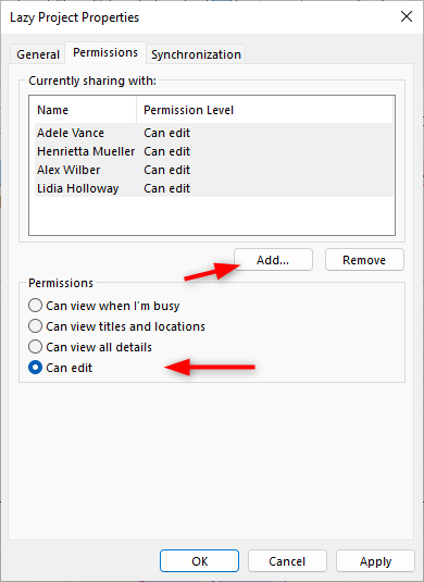 Trong hộp thoại, nhấp vào Add để chọn thành viên bạn muốn cấp quyền truy cập vào lịch. Tiếp theo, quyền cần cấp. Ví dụ: có thể chỉnh sửa hoặc chỉ xem tất cả chi tiết > click Apply.