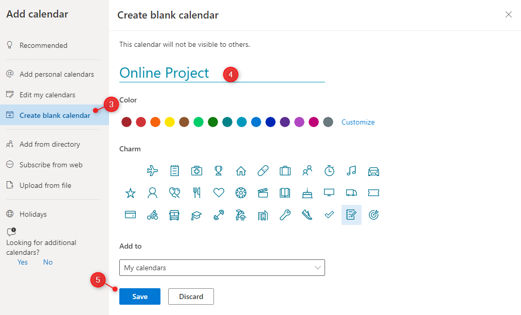 - Đặt tên, màu sắc và biểu tượng tùy chọn cho lịch