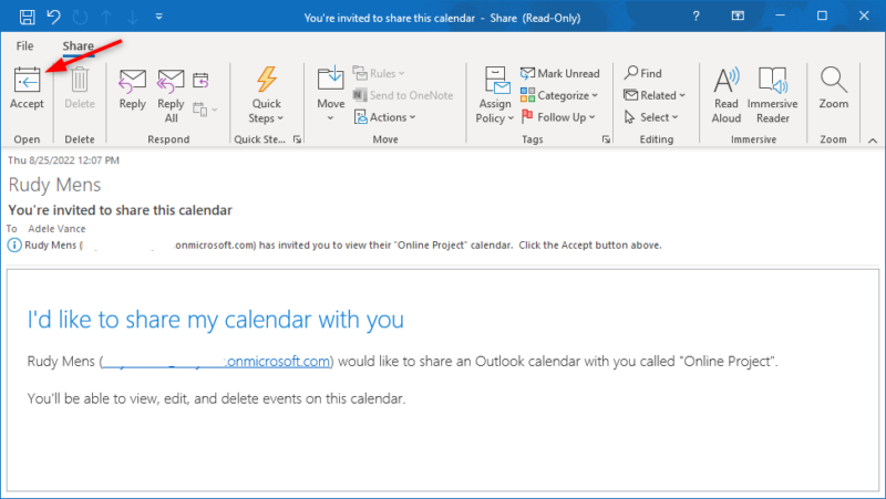 Người dùng cần tự thêm lịch dùng chung vào Outlook. Có hai cách để thực hiện việc này. Khi bạn chia sẻ lịch với đồng nghiệp, họ sẽ tự động nhận được email mời. Người dùng chỉ cần nhấp vào “Chấp nhận” để thêm lịch dùng chung vào Outlook của họ.