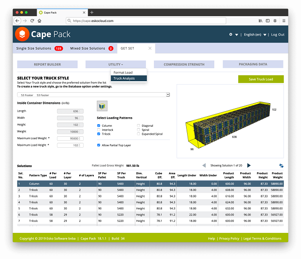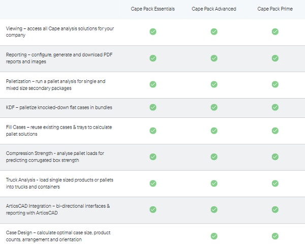 Cape Pack là một phần mềm tối ưu hóa đóng gói và xếp pallet của công ty Esko, giúp doanh nghiệp giảm chi phí vận chuyển, cải thiện hiệu quả sử dụng không gian và vật liệu, đồng thời tạo ra chuỗi cung ứng đóng gói bền vững hơn. Phần mềm này cho phép người dùng thiết kế kích thước thùng mới, xây dựng mẫu pallet hiệu quả và phân tích khả năng chịu lực của tải hàng hóa, giúp tiết kiệm tài nguyên và giảm lượng khí thải carbon.