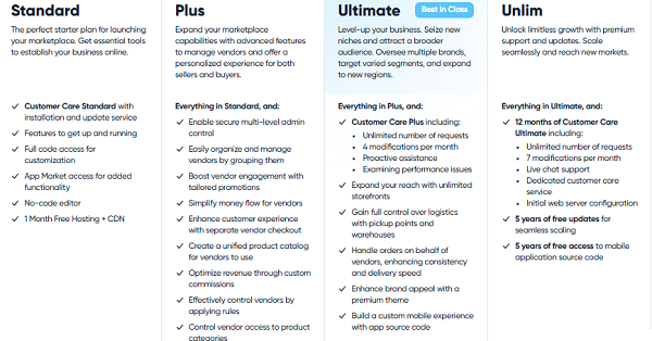 Multi-Vendor Unlim: Mức cao nhất, hỗ trợ riêng. Dành cho quy mô lớn với hỗ trợ kỹ thuật và hiệu suất tối đa