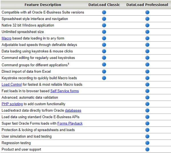 Trong một giao diện người dùng duy nhất, DataLoad cung cấp một loạt các công cụ tích hợp để cho phép người dùng tải dữ liệu vào Oracle E-Business Suite và các hệ thống doanh nghiệp khác. Tóm tắt về chức năng DataLoad được hiển thị bên dưới.