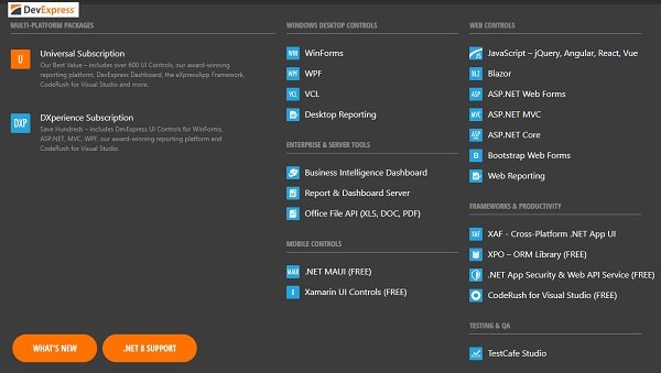 - DevExtreme: Các công cụ phát triển cho ứng dụng web và di động hỗ trợ JavaScript, Angular, React, và Vue, bao gồm các điều khiển UI và thư viện dữ liệu.