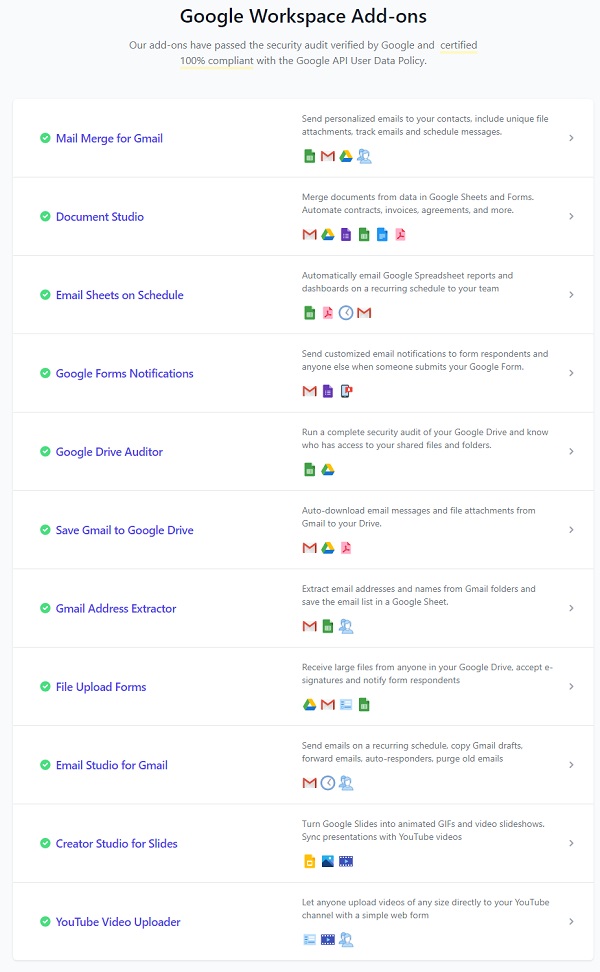 Những add-on này giúp tự động hóa các tác vụ như gửi email cá nhân hóa, tạo tài liệu từ dữ liệu, báo cáo qua email, và kiểm tra bảo mật Google Drive.