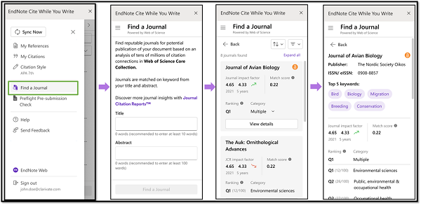 Find a Journal của EndNote là một công cụ xuất bản học máy nâng cao, có sẵn trực tiếp trong plugin Cite While You Write hàng đầu trong ngành. Hãy nhận trợ giúp tìm tạp chí phù hợp nhất với công việc của bạn bằng cách sử dụng các yếu tố chính của bản thảo.