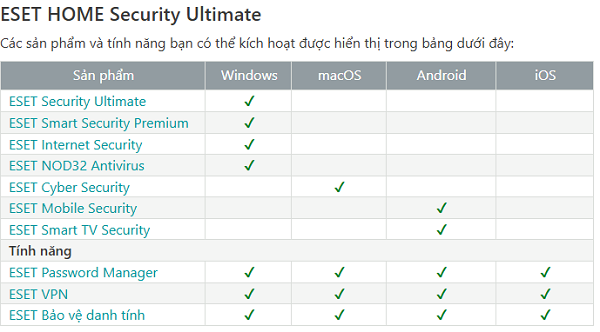 ESET HOME Security Ultimate: Phiên bản cao nhất — ngoài những gì Premium có, thêm VPN, bảo vệ danh tính, tính năng bổ sung về quyền riêng tư, cũng như các công cụ quản lý mở rộng cho nhiều thiết bị.