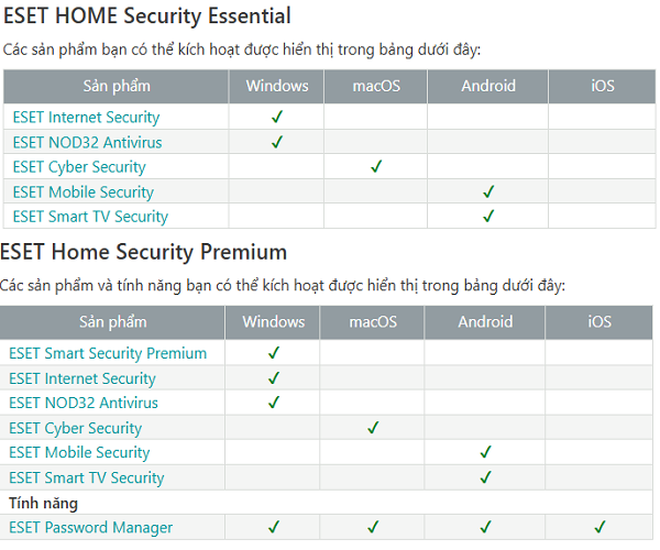 Các phiên bản ESET HOME Security bao gồm: