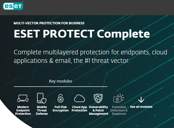 ESET PROTECT Complete là một giải pháp bảo mật doanh nghiệp toàn diện và cao cấp nhất của ESET, cung cấp bảo vệ đa lớp cho điểm cuối, ứng dụng đám mây (như Microsoft 365, Google Workspace), email, và các mối đe dọa zero-day, kèm theo các công cụ quản lý tập trung thông qua nền tảng ESET PROTECT. Gói này bao gồm các tính năng nâng cao như bảo mật ứng dụng đám mây, mã hóa toàn bộ đĩa, bảo vệ máy chủ tệp, và quản lý lỗ hổng/bản vá