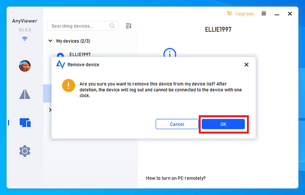 Khi số lượng thiết bị được chỉ định cho tài khoản AnyViewer đạt đến giới hạn và bạn đăng nhập vào tài khoản trên một thiết bị mới, bạn cần xóa thiết bị khỏi danh sách Thiết bị của tôi, sau đó thiết bị mới có thể được liệt kê tại đây. Các bước để xóa như sau.