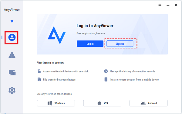Bạn có thể truy cập từ xa vào PC từ PC, iPhone hoặc iPad để làm việc từ xa, mọi lúc mọi nơi qua Internet. Khi bạn sử dụng AnyViewer để truy cập từ xa, trước tiên hãy tạo và đăng nhập vào tài khoản.