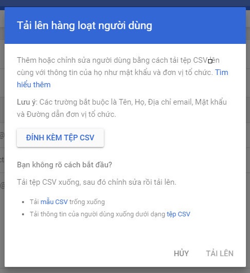 Giao diện tải lên hàng loạt hiện ra > Click ĐÍNH KÈM TỆP CSV > tìm và tải file danh sách người dùng hàng loạt lên.