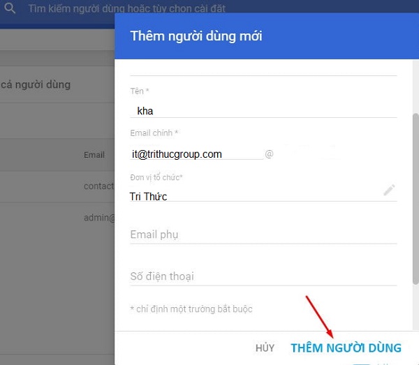 Giao diện thêm người dùng hiện ra > Nhập đầy đủ các thông tin người dùng > Click Thêm người dùng.