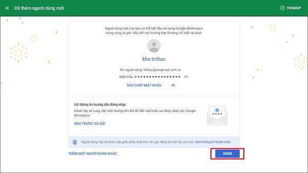 Cửa sổ thông báo thêm người dùng mới thành công hiện ra > Click Xong để hoàn tất.