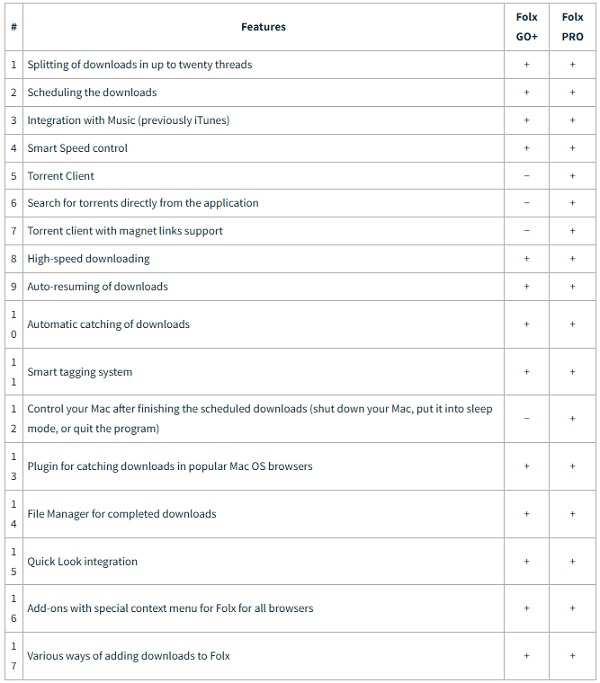 Dưới đây là bảng so sánh tính năng của Folx GO+ và Folx PRO:
