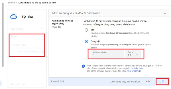 Trên giao diện quản lý dung lượng người dùng > click Chọn Nhóm cần set dung lượng > nhập Dung lượng mong muốn, đơn vị tính > click Lưu.