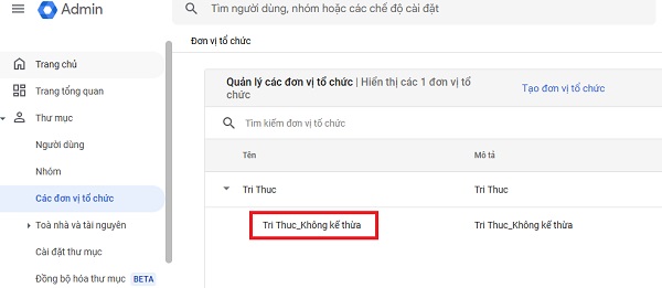 Trên giao diện Admin Console > Chọn Thư mục > Các đơn vị tổ chức > click chọn Tạo đơn vị tổ chức.
