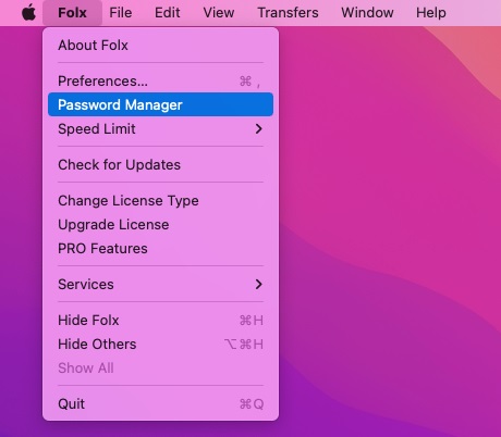Để mở Trình quản lý mật khẩu > khởi động Folx > chọn Password Manager trên menu: