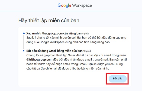 Cửa sổ xác thực miền hiện ra > click Bắt đầu để thực hiện quá trình nhập các record của Google vào trình quản lý domain để xác thực.