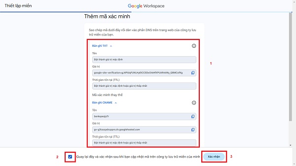 Copy các record google trên bảng Thêm mã xác mình > truy cập trang quản trị Miền/Domain > dán các record và giá trị này vào > Lưu lại