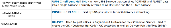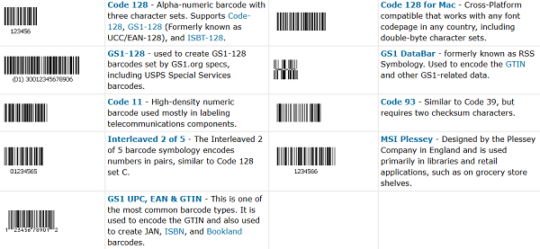 IDAutomation cung cấp hơn 30 công cụ phông chữ, macro và mã nguồn để tích hợp ứng dụng dễ dàng các loại mã vạch sau. Nhiều loại được cung cấp kèm ví dụ để sử dụng trong Microsoft Word, Excel, Access và Crystal Reports.