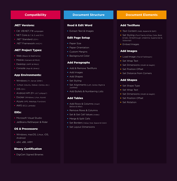 IronWord là thư viện C# Word DOCx để tạo và chỉnh sửa tài liệu Word trong .NET. API thân thiện với người dùng của nó cho phép các nhà phát triển thêm chức năng xử lý tài liệu Word vào các dự án .NET trong vài phút