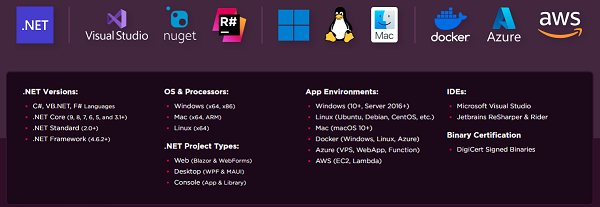 Được thiết kế cho C#, F# và VB.NET chạy trên .NET 9, 8, 7, 6, Core, Standard hoặc Framework