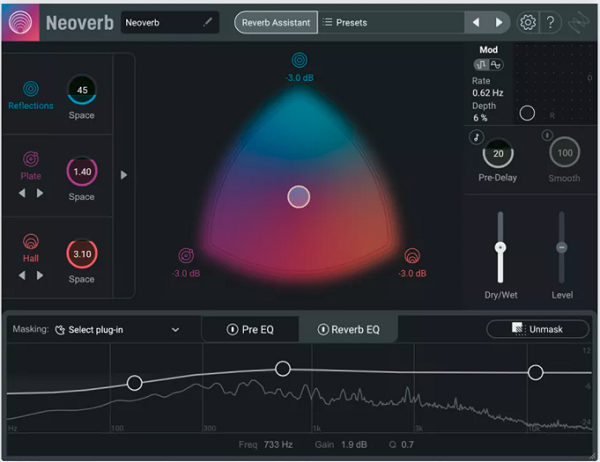 EQ Reverb của iZotope Neoverb giúp giữ cho bản hòa âm của bạn trong trẻo và được kiểm soát trong bản phối, với tính năng Unmasking do AI cung cấp, tính năng này lắng nghe và unmasking tín hiệu khô của bạn để có âm thanh chuyên nghiệp trong trẻo.