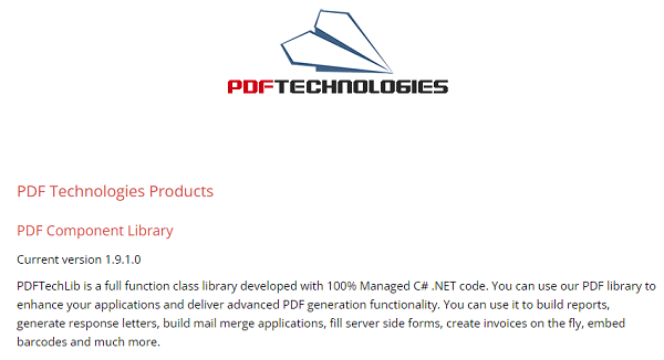 PDFTechLib là một thư viện lớp đầy đủ chức năng được phát triển với mã C# .NET được quản lý 100%. Bạn có thể sử dụng thư viện PDF của chúng tôi để nâng cao ứng dụng của mình và cung cấp chức năng tạo PDF nâng cao. Bạn có thể sử dụng nó để xây dựng báo cáo, tạo thư phản hồi, xây dựng ứng dụng trộn thư, điền biểu mẫu phía máy chủ, tạo hóa đơn ngay lập tức, nhúng mã vạch và nhiều hơn nữa.