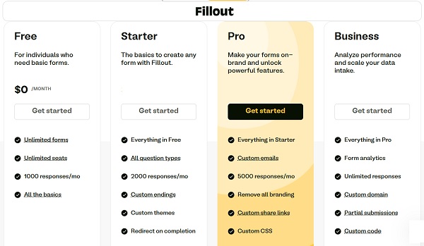 https://www.fillout.com. - Đăng ký: Nhấn vào nút “Sign up” hoặc “Get started” để đăng ký tài khoản mới. Bạn có thể sử dụng địa chỉ email hoặc liên kết nhanh với tài khoản Google để bắt đầu.