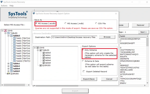 Lưu tệp đầu ra trong tệp ACCDB, MDB và CSV sau khi khôi phục cơ sở dữ liệu Access