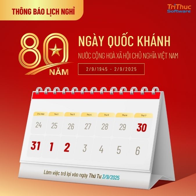 Nhân dịp kỷ niệm 80 năm Quốc Khánh nước Cộng hòa Xã hội Chủ nghĩa Việt Nam (02/9/1945 – 02/9/2025), Tri Thức Software trân trọng thông báo đến Quý Khách Hàng và Đối Tác lịch nghỉ lễ như sau: