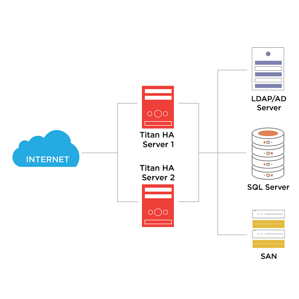 Titan HA có thể được thu nhỏ và phân cụm để xử lý số lượng người dùng không giới hạn. Cơ sở dữ liệu tài khoản người dùng có thể được lưu trữ từ xa trong Cơ sở dữ liệu SQLServer bên ngoài; hoặc, trong trường hợp xác thực người dùng dựa trên AD/LDAP, trên máy chủ bên ngoài — có thể truy cập được từ nhiều nút. Việc sử dụng cơ sở dữ liệu bên ngoài để lưu trữ cấu hình và thông tin tài khoản người dùng sẽ tạo ra một hệ thống có thể mở rộng hoàn toàn, trong đó nhiều nút chia sẻ khối lượng công việc và cho phép bảo trì hệ thống mà không tạo ra giới hạn quyền truy cập của người dùng. Trong trường hợp chuyển đổi dự phòng, nếu một Titan HA bị ngoại tuyến, lưu lượng sẽ được chuyển hướng đến Titan HA tiếp theo trong danh sách ưu tiên. Khi máy chủ khả dụng trở lại, lưu lượng truy cập sẽ tự động định tuyến trở lại để chia sẻ tải và dịch vụ không bị gián đoạn. Titan HA hoàn toàn tương thích với Titan DMZ Server để đảm bảo bảo vệ DMZ hoàn chỉnh cho môi trường cụm của bạn.